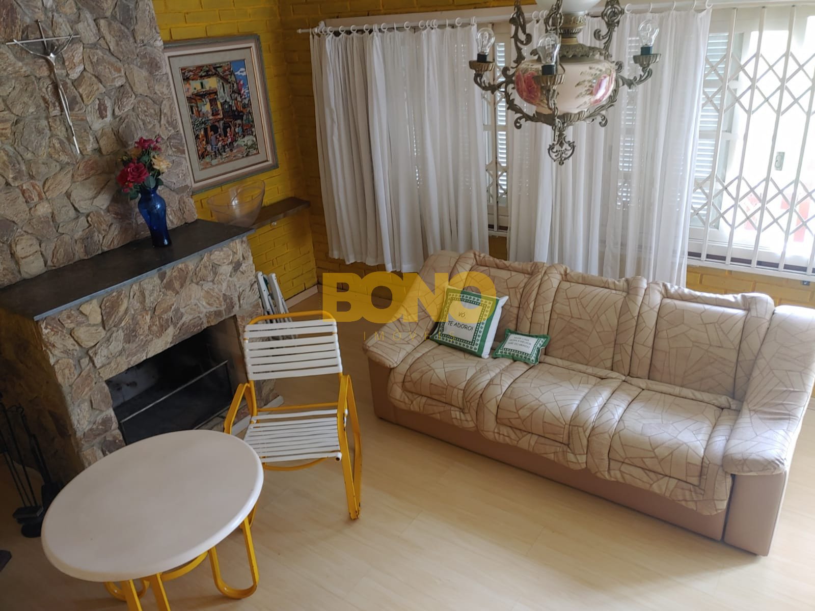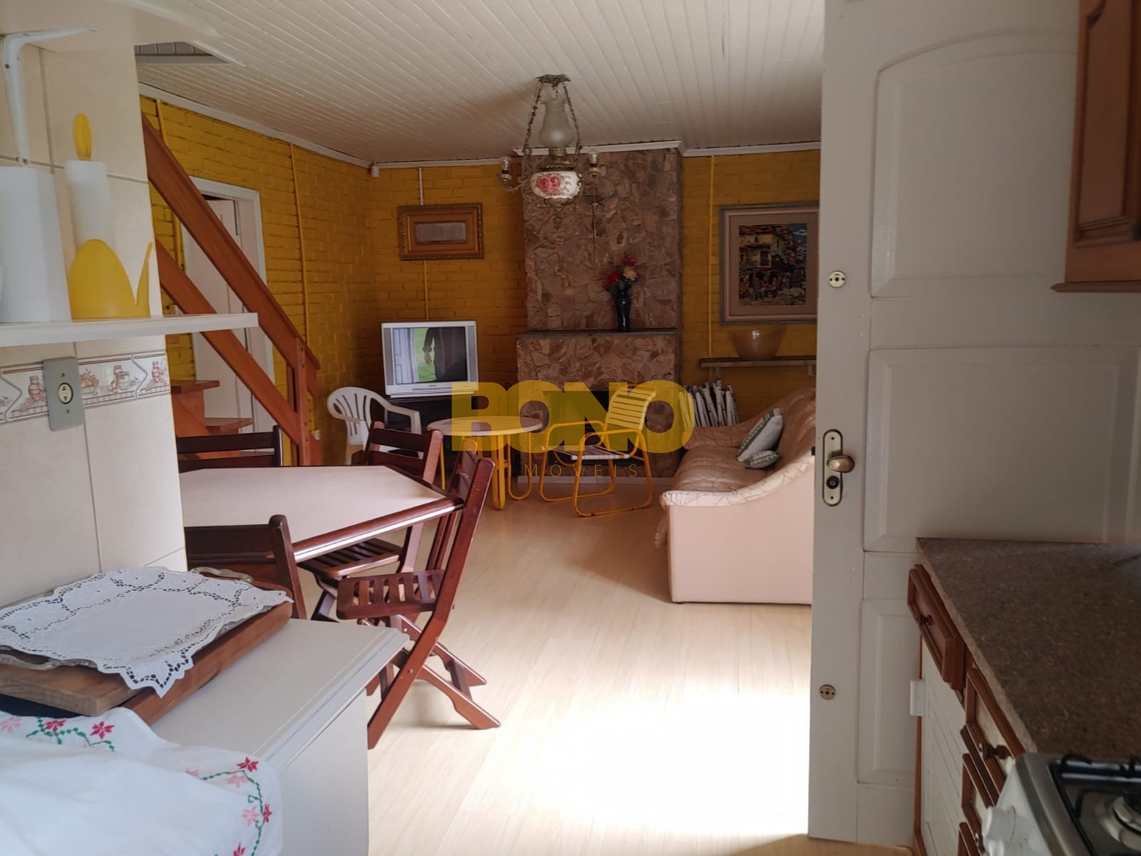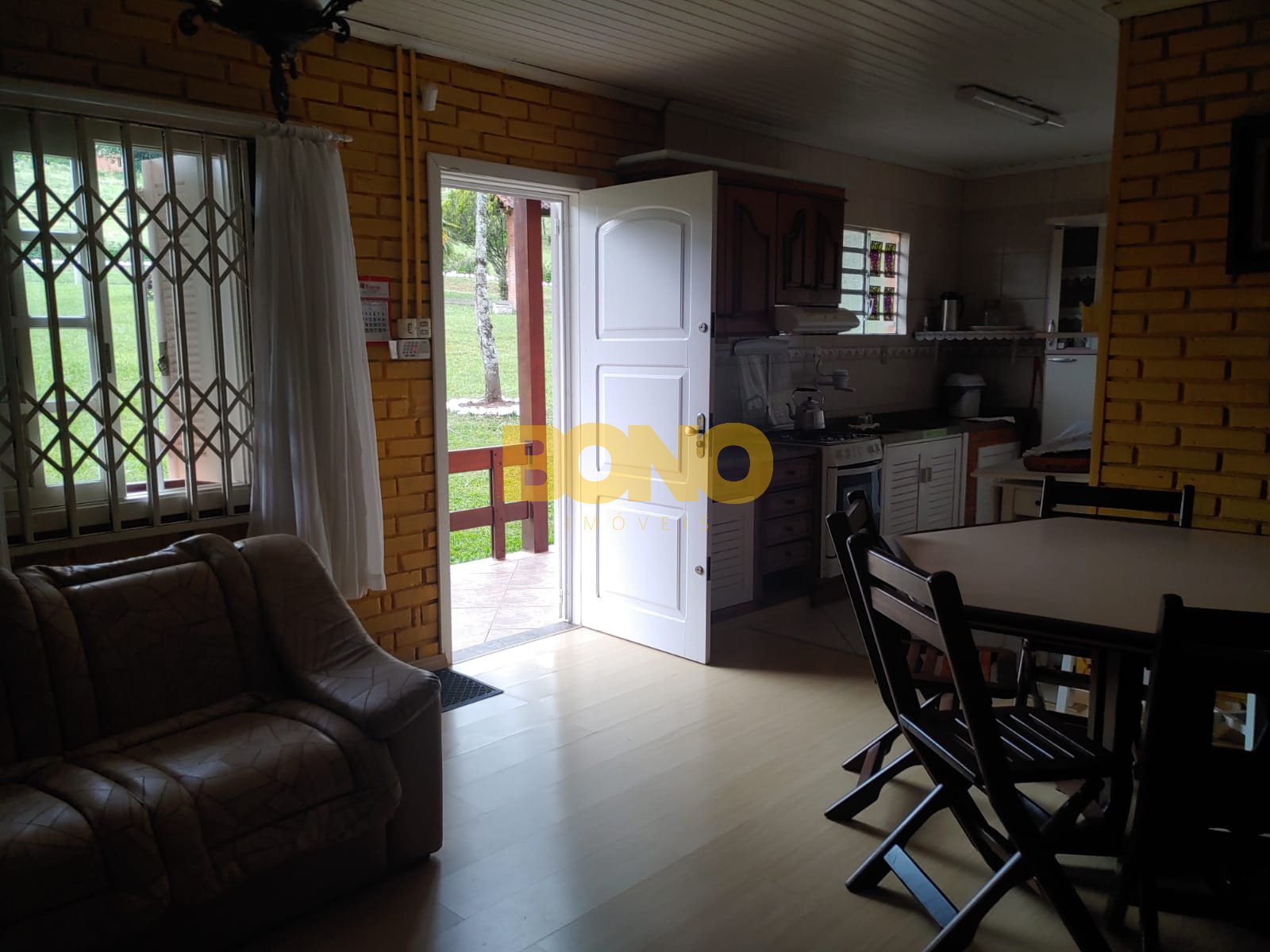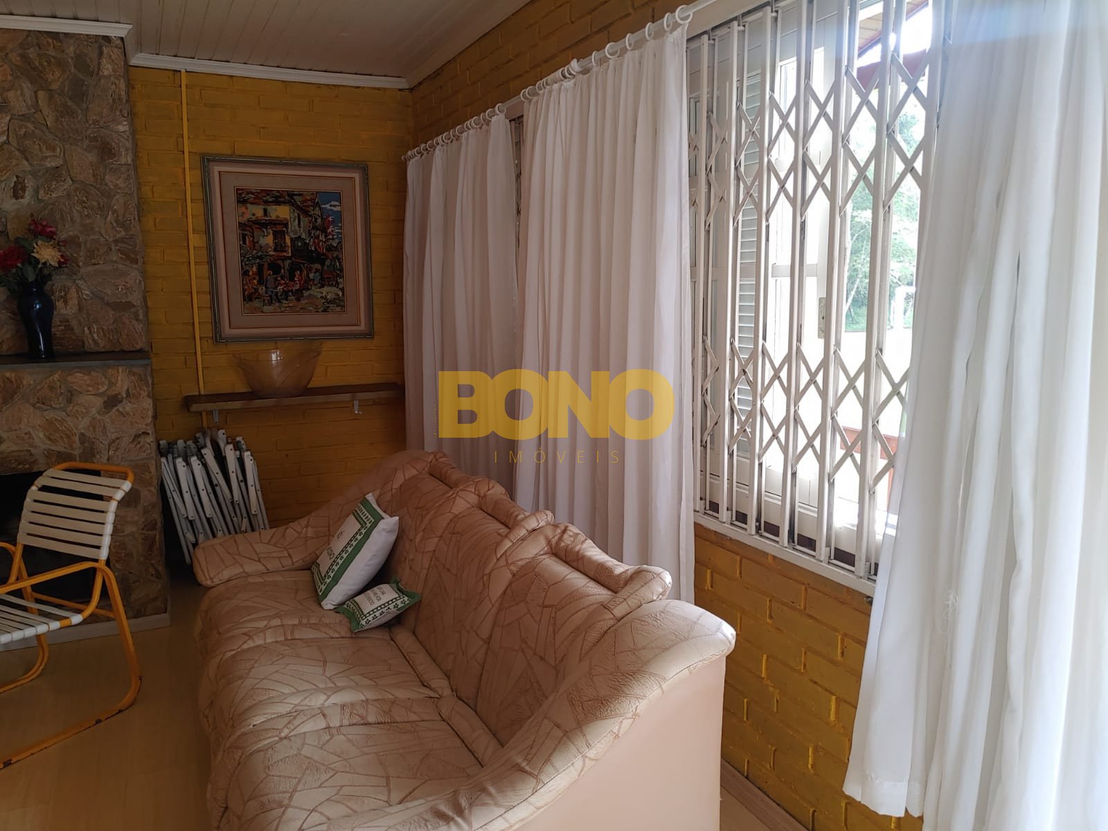 A casa possui lareira, móveis e está em ótimo estado de conservação. A construção é em alvenaria e as esquadrias são de madeira.