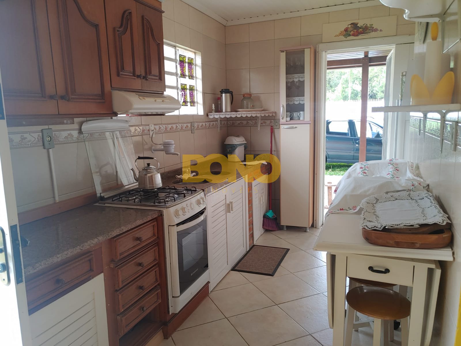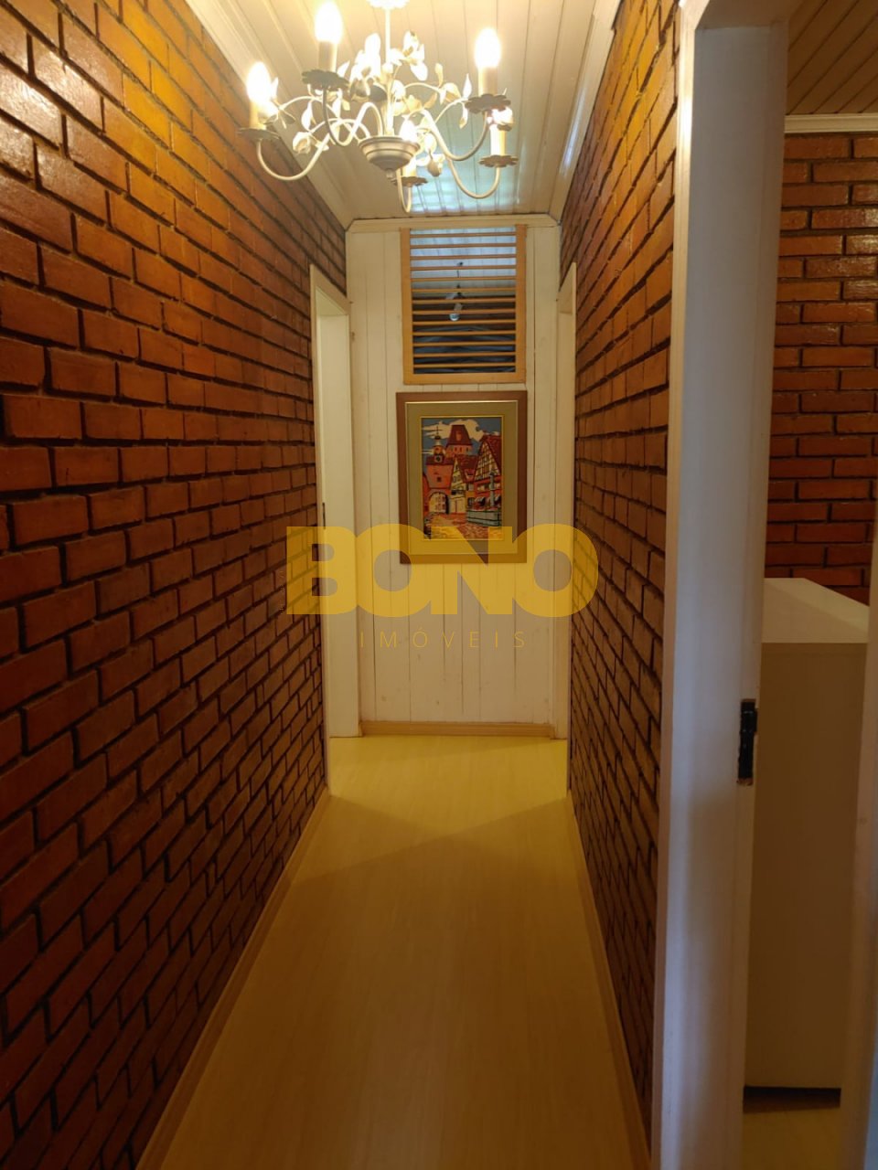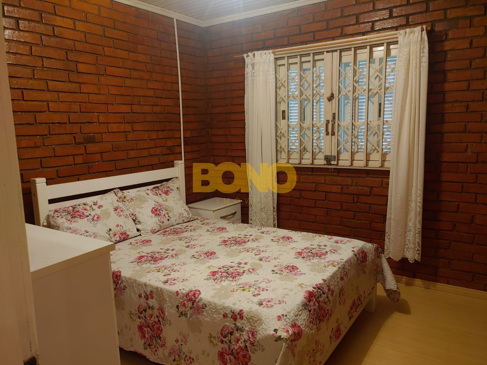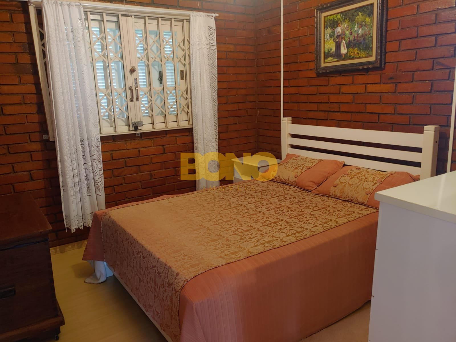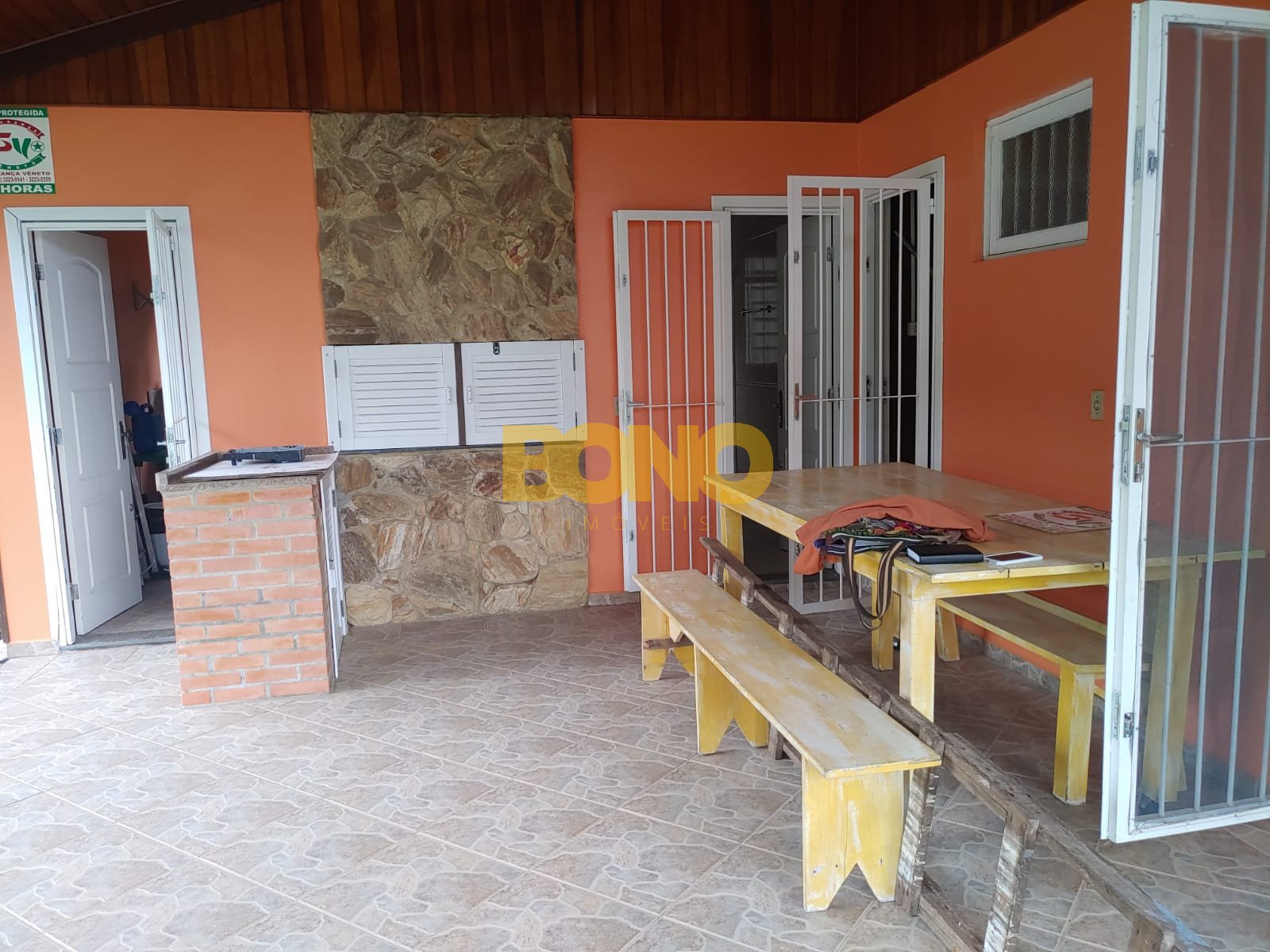 A casa possui lareira, móveis e está em ótimo estado de conservação. A construção é em alvenaria e as esquadrias são de madeira.