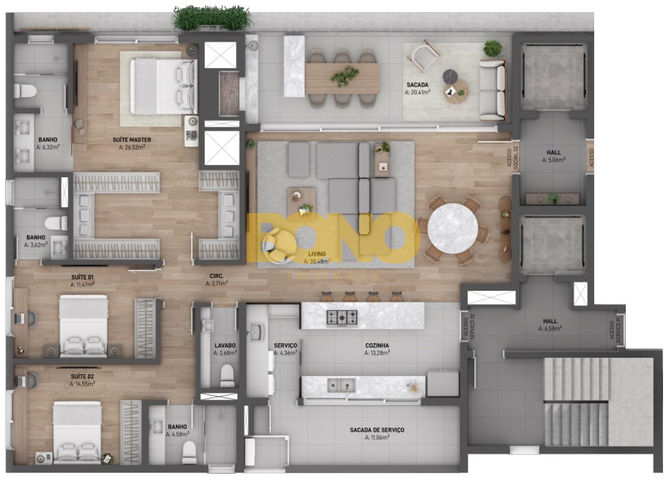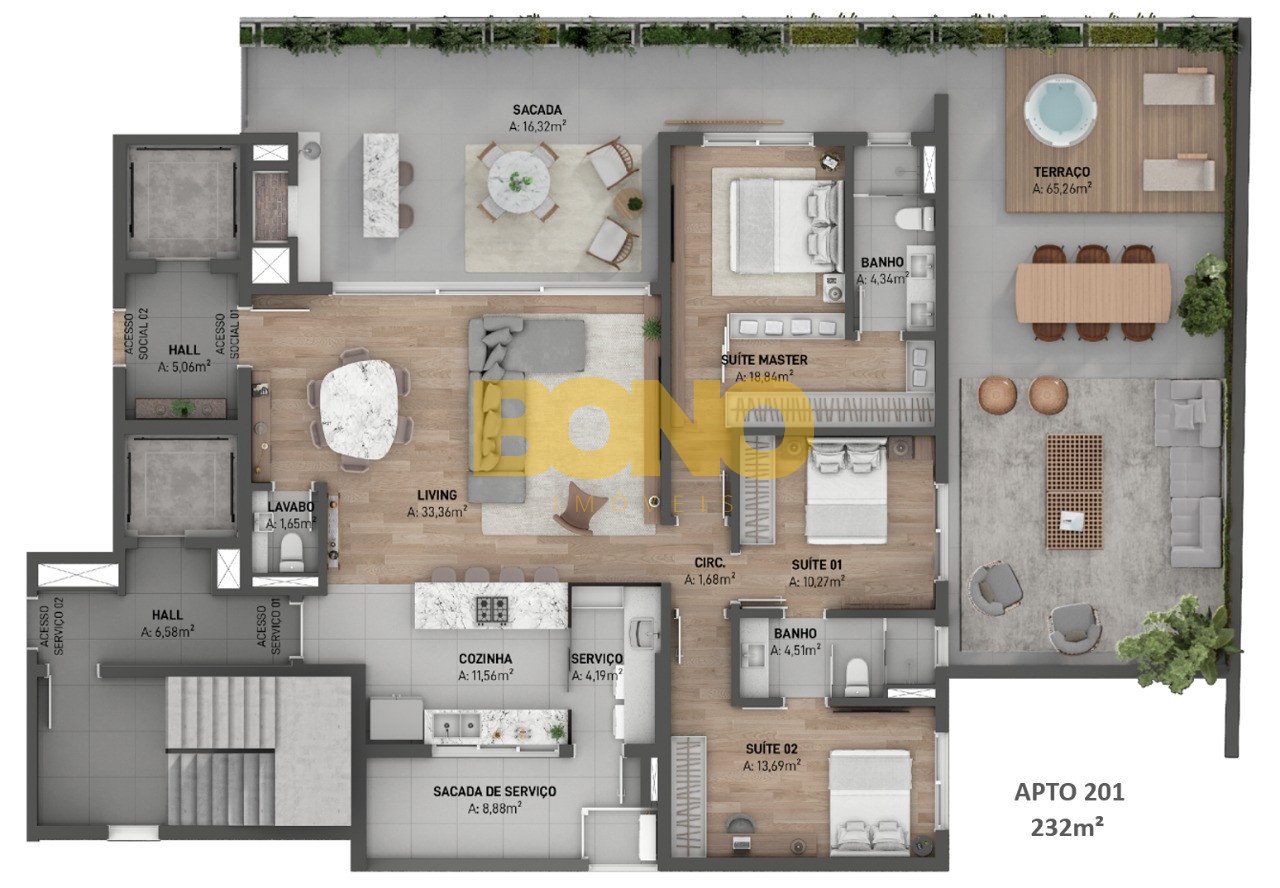 Com orientação solar NORTE, os apartamentos possuem de 156m2 a 191m2 privativos, com amplas sacadas e grandes esquadrias que possibilitam uma excelente integração entre o living e a sacada. Além disso os apartamentos contam com