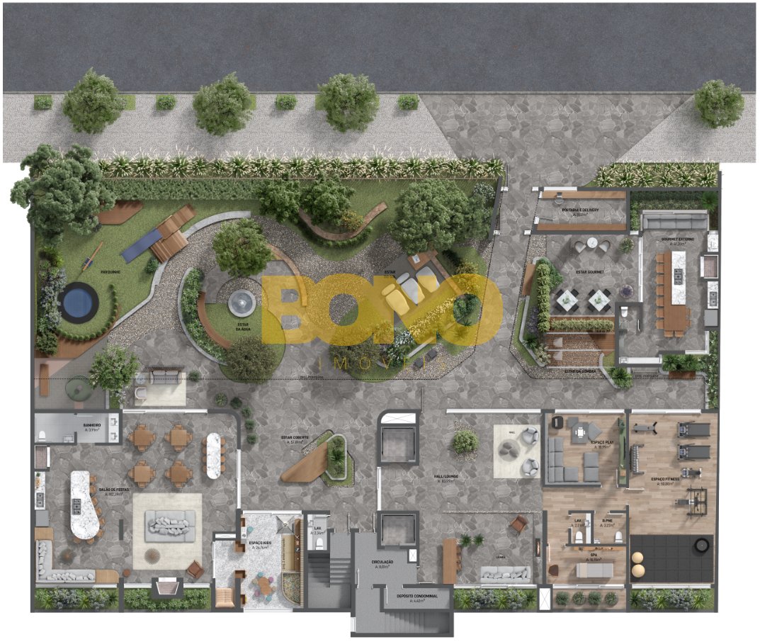 A área de lazer conta com mais de 600m2 de área de lazer a céu aberto, além de 350m2 de área de lazer coberta, oferecendo uma área de lazer completa e pensada em cada detalhe para proporcionar aos moradores comodidade, momentos de lazer, de pausa, e também de celebração.
