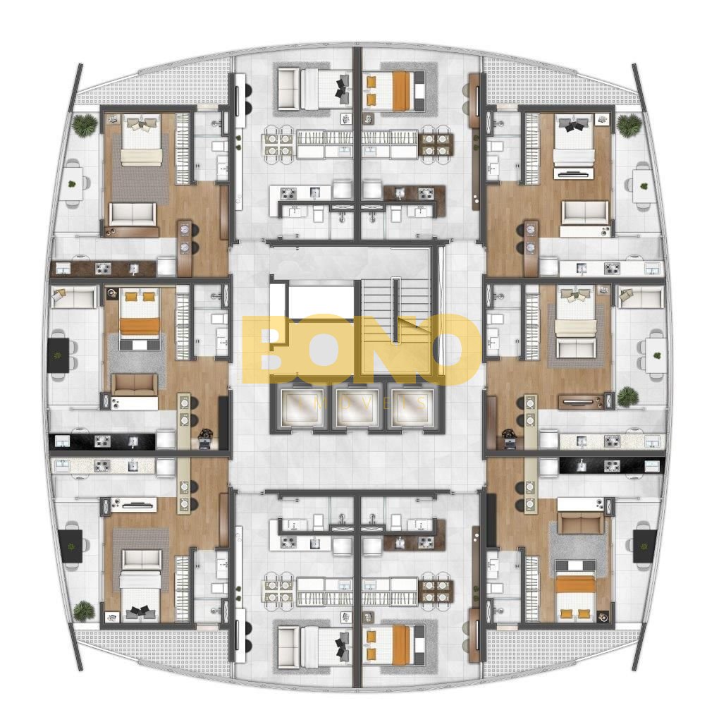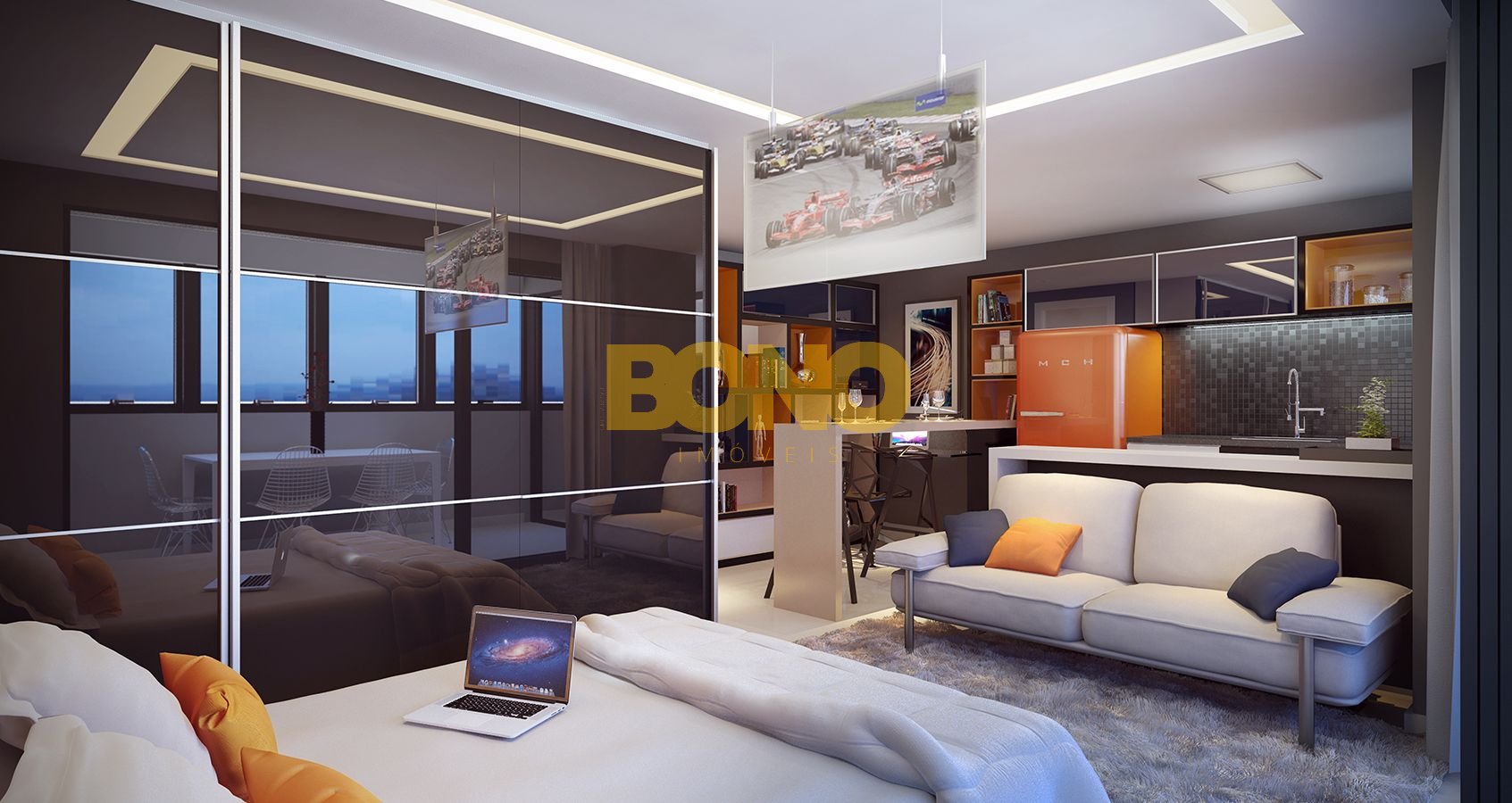 Os apartamentos tipo estúdio do Hélios Residencial são versáteis, adaptados às necessidades de funcionalidades e espaço sem abrir mão do conforto.