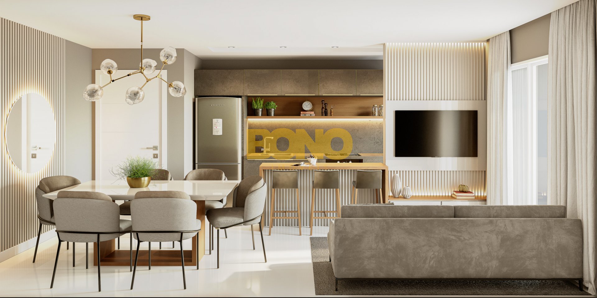 • Estar e jantar integrados com sacada fechada, proporcionando maior funcionalidade e charme ao ambiente;