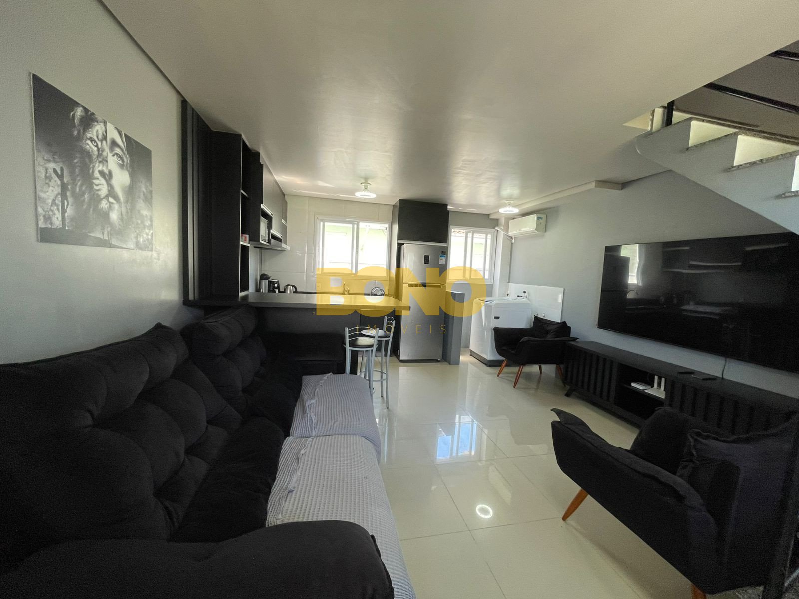 Sala e cozinha integradas em conceito aberto