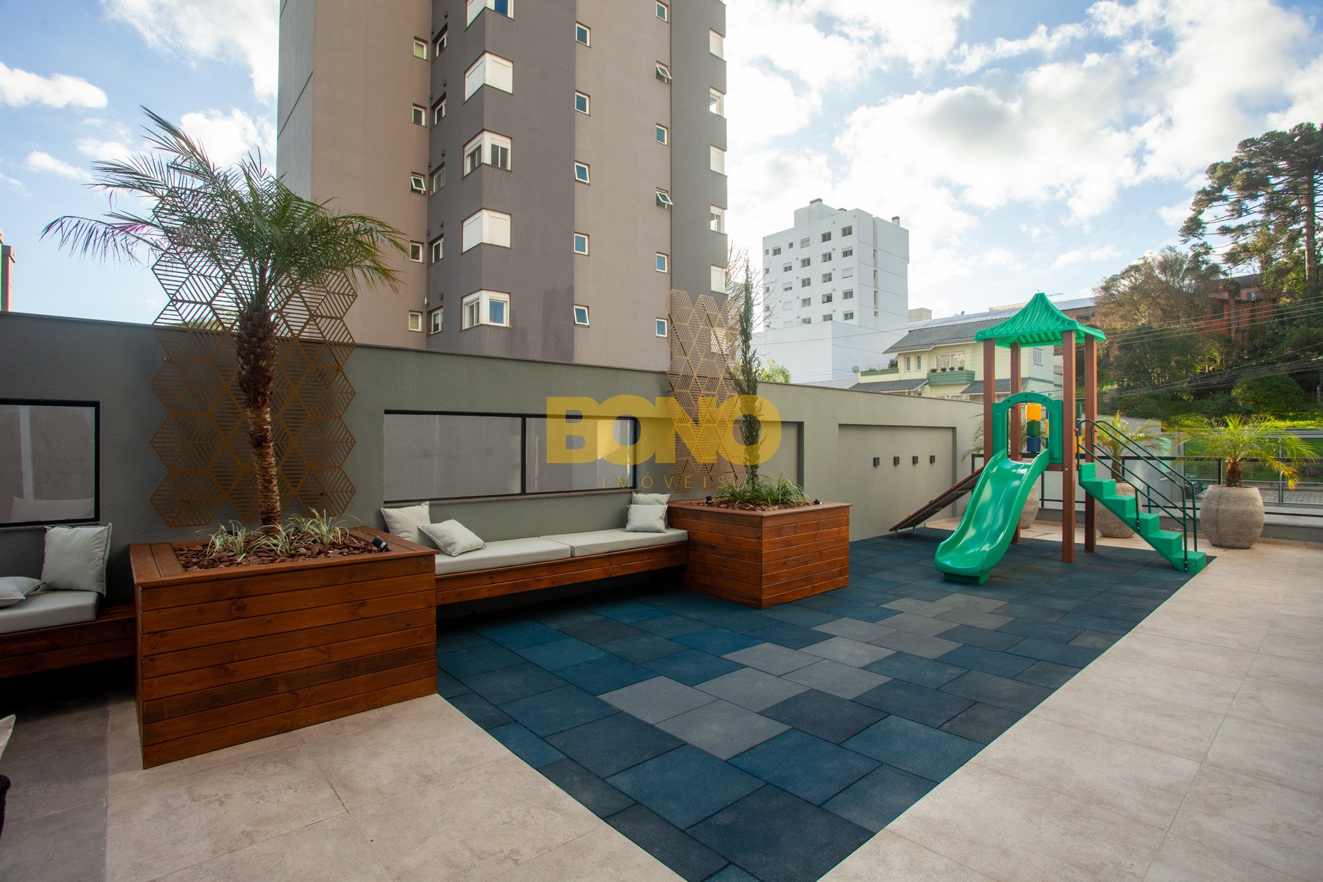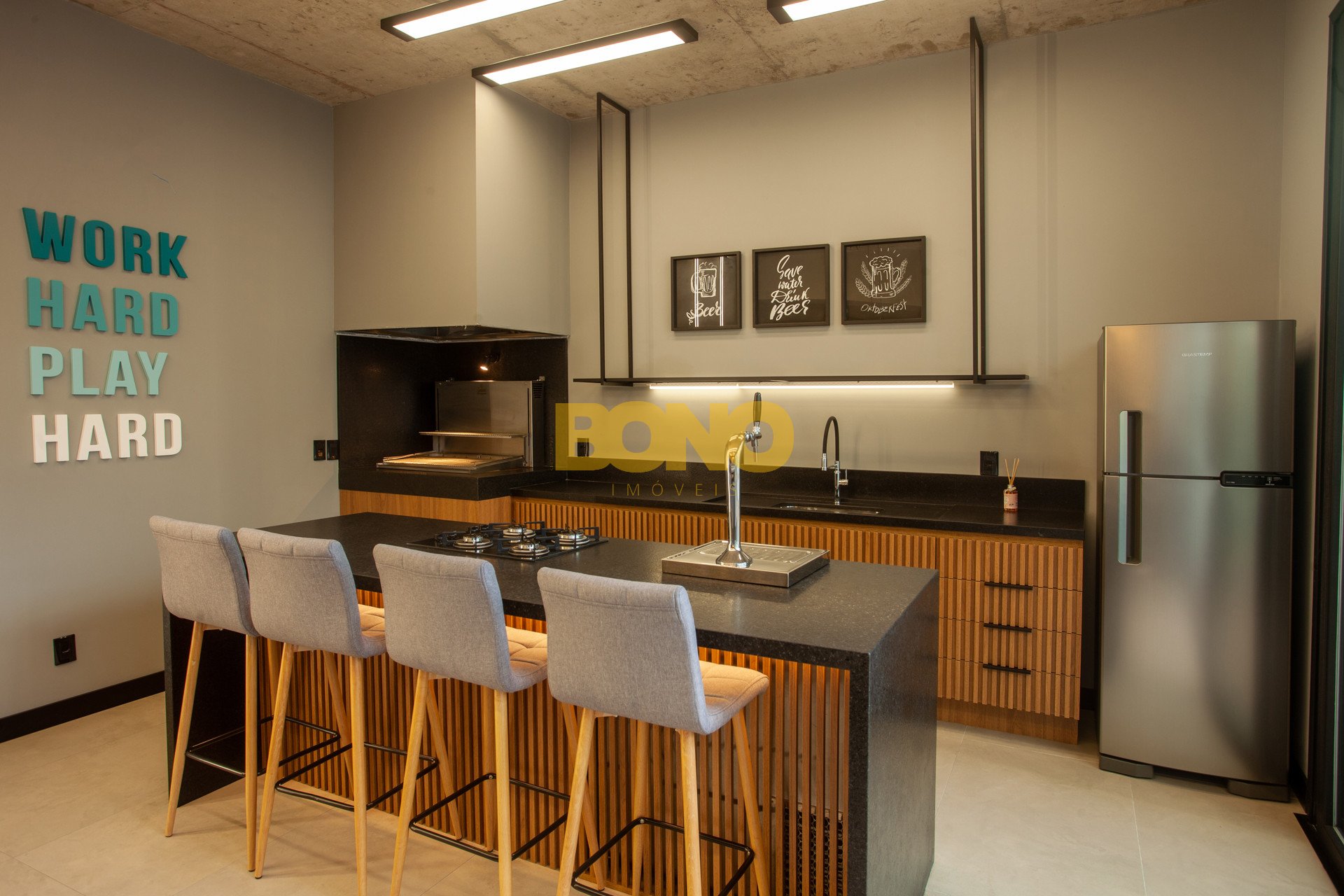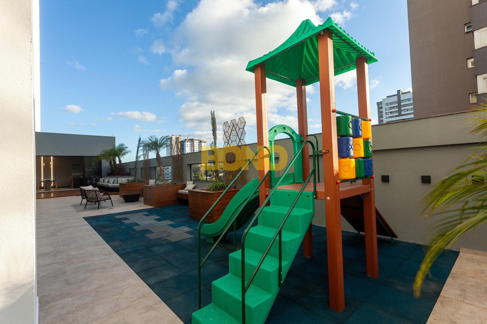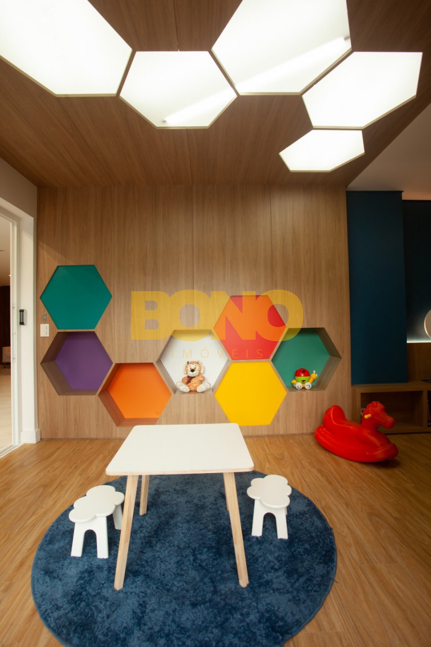 Hall de entrada elegante, espaço saúde, salão de festas com churrasqueira, lounge, espaço kids, pub, deck, terraço com lareira , playground, bosque privativo de 700m , lavanderia coletiva e vaga para carregamento de carro elétrico.