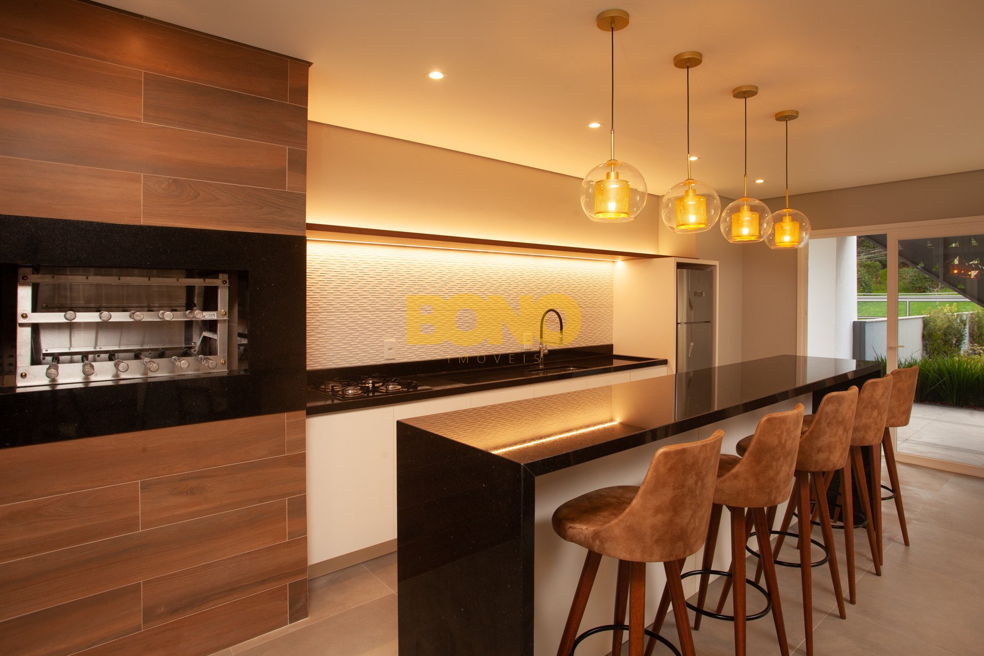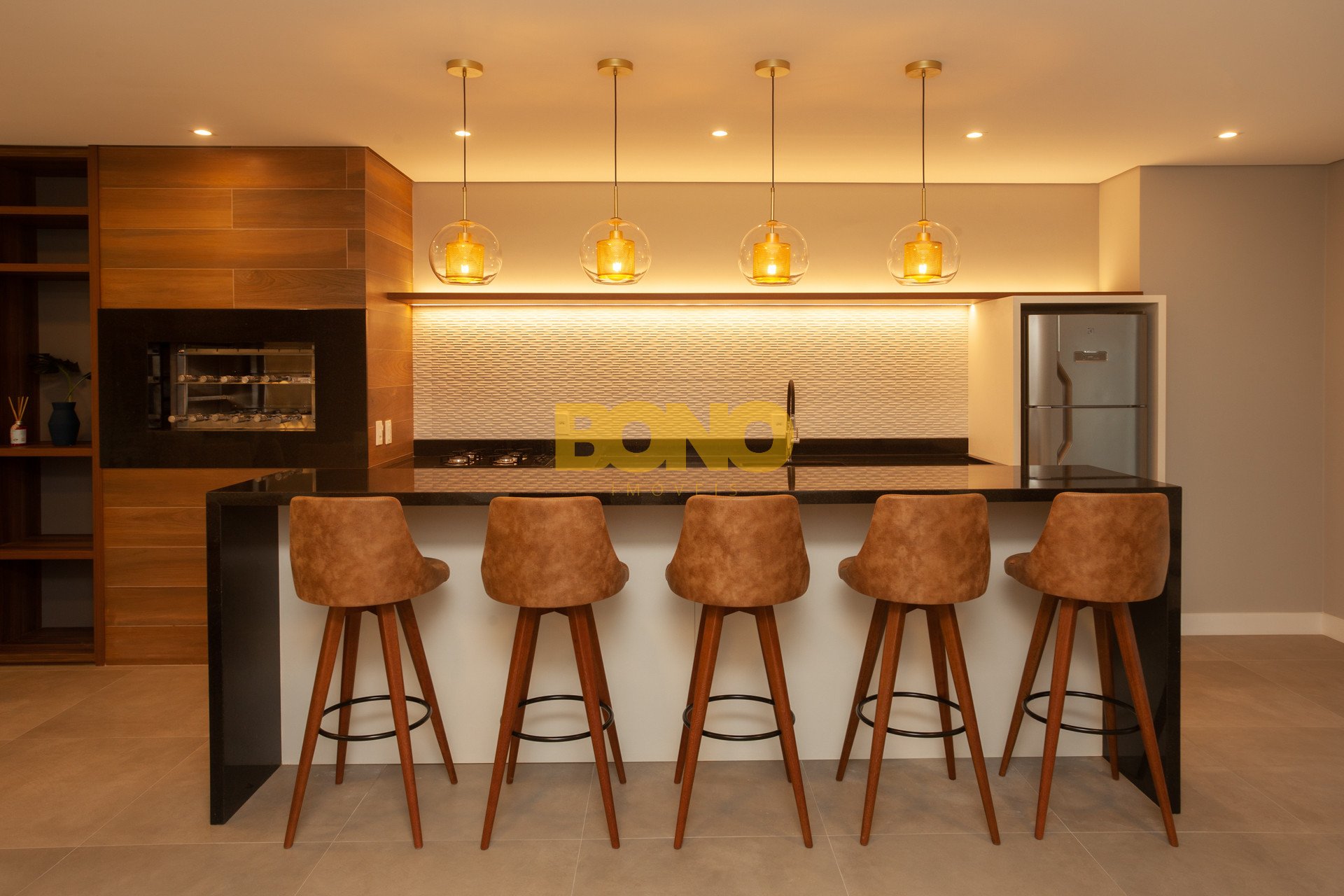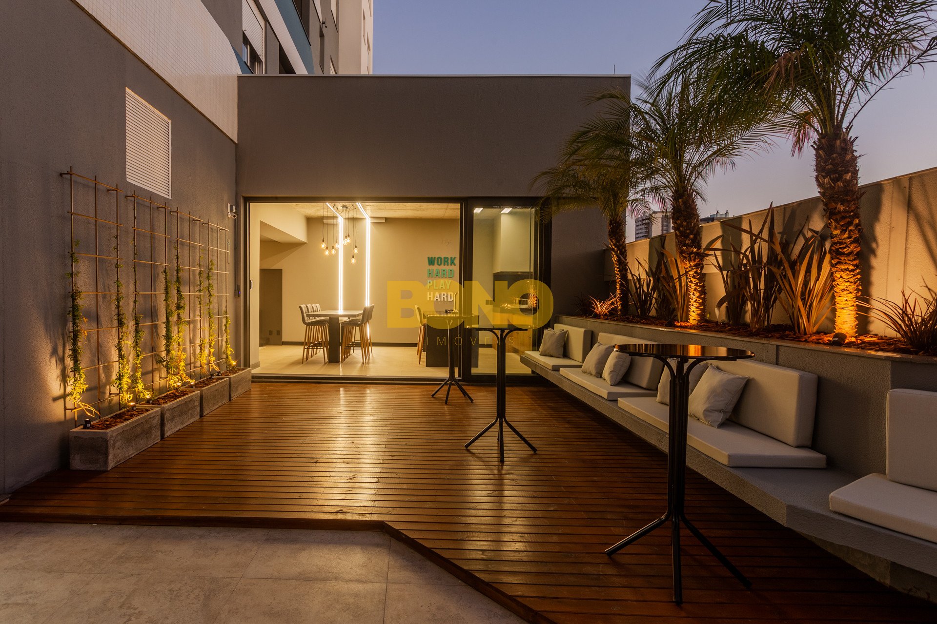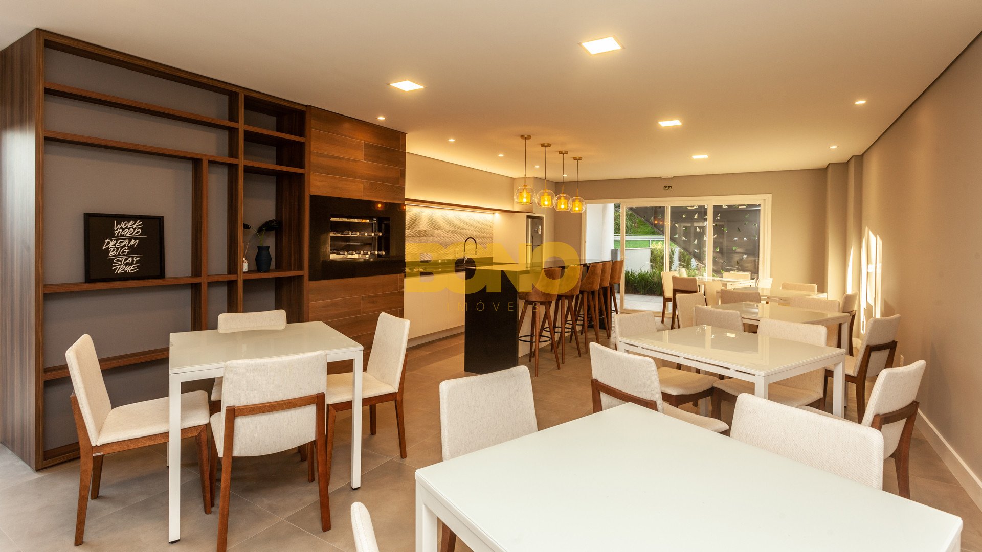 Hall de entrada elegante, espaço saúde, salão de festas com churrasqueira, lounge, espaço kids, pub, deck, terraço com lareira , playground, bosque privativo de 700m , lavanderia coletiva e vaga para carregamento de carro elétrico.