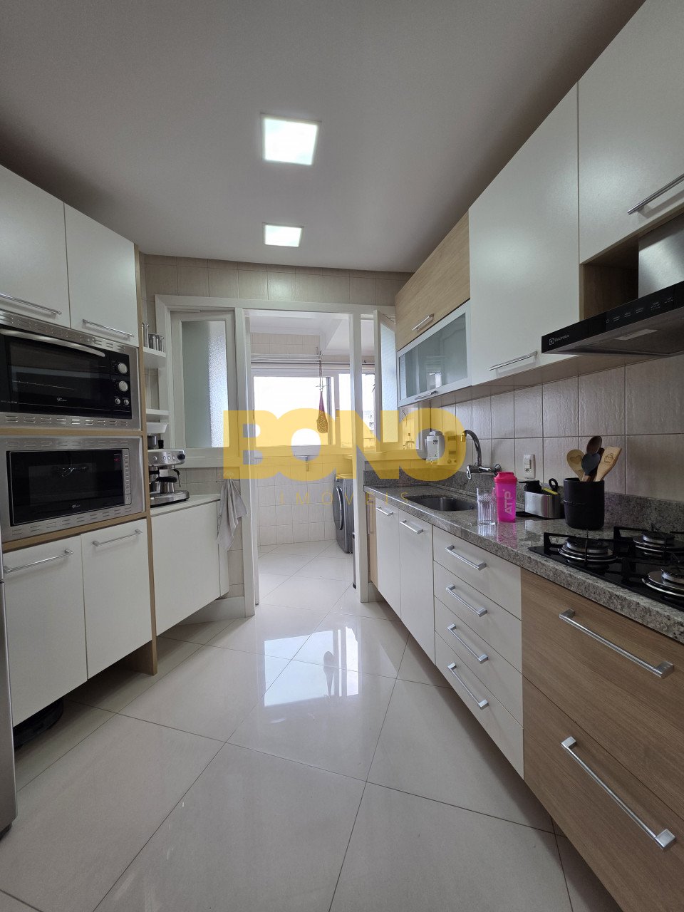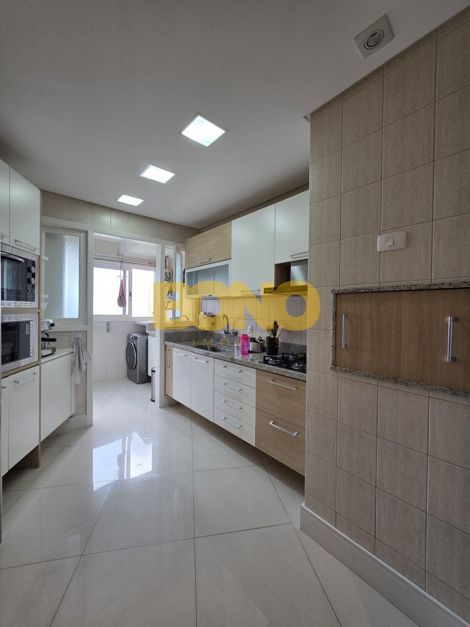 A cozinha planejada é equipada com churrasqueira, coifa, cooktop, forno elétrico, micro-ondas, coifa, mesa com cadeiras, além de aquecedor de água em todas as torneiras, gás central e medidores individuais, área de serviço separada e planejada, com aquecedor de água, ficam todas luminárias da sala e cozinha, vaga de garagem coberta.